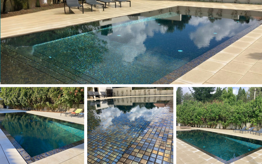 A escolha de um revestimento arrojado e simultaneamente elegante, fez desta piscina um autêntico sonho! Revestimento em pastilha de vidro Ezarri, referência Alexander.